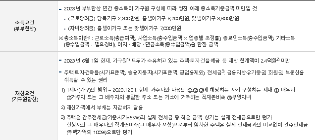 부부합산 연간 총 소득이 단독가구 2,200만원, 홀벌이 가구 3,200만원, 맞벌이 가구 3,800만원 미만을 충족해야 한다.